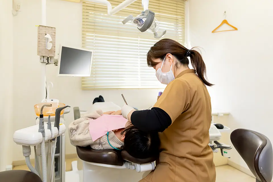 歯科医院で行うプロフェッショナルケアでは、セルフケアで落とせない汚れを専用の機械で取り除き、歯ぐきの状態を確認しながら、必要に応じてフッ素塗布や歯みがき指導を行います。